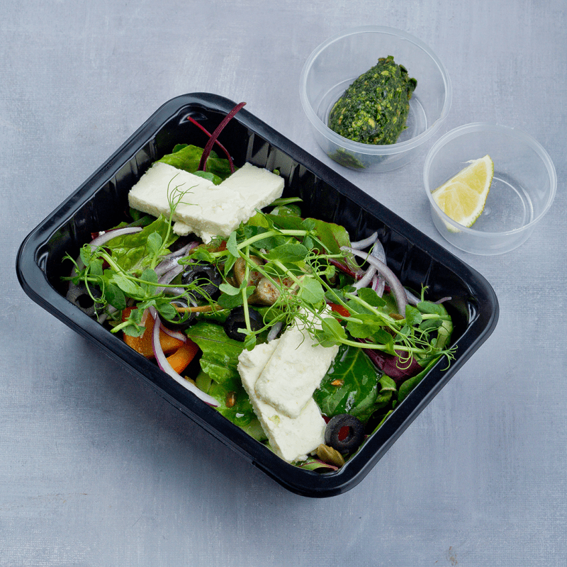 Сыр фета от Христоса Кесидиса, маслины, огурцы, перец болгарский, черри, микс зелени, голладский лук, каперсы / 170гр