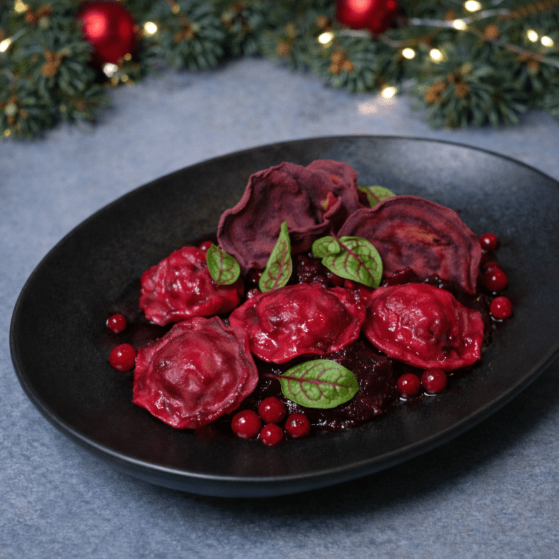 Нежная утка в тонком тесте, соус из свёклы и брусники с лёгкой кислинкой, хрустящие свекольные чипсы и свежая микрозелень.
