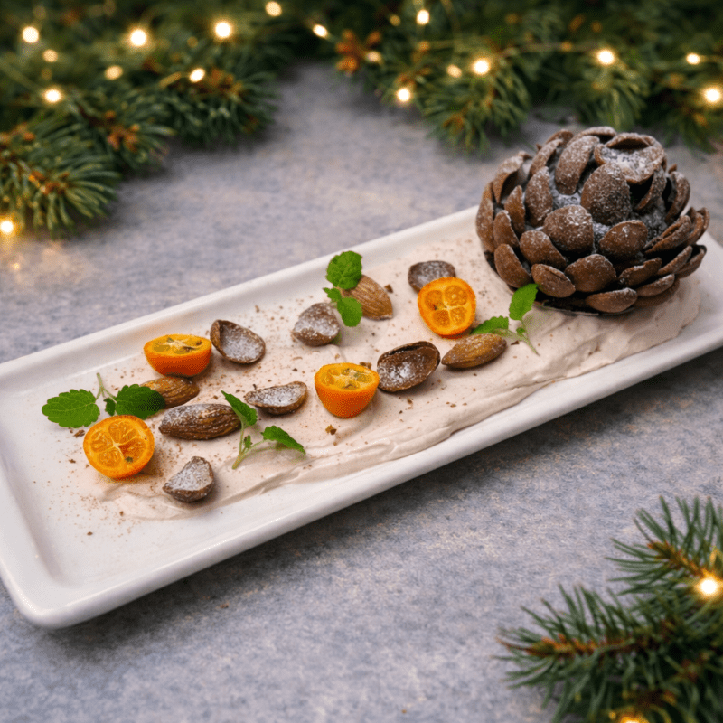 Шоколадный десерт на основе классической «картошки» с ореховым муссом, миндалём и тёплыми пряными нотами корицы и мускатного ореха. Подаётся с кумкватом и лёгкой пудровой вуалью — плотный, уютный и по-зимнему насыщенный.